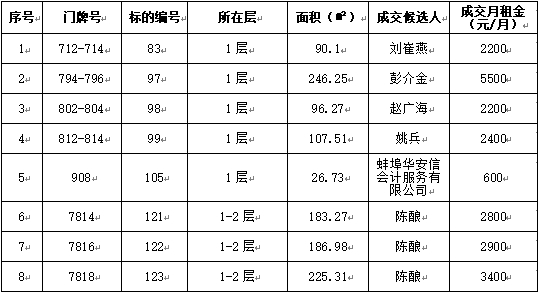喜迎門小區(qū)部分商鋪公開競價招租工作已經(jīng)結(jié)束,成交候選人已經(jīng)確定?,F(xiàn)將競租結(jié)果公示如下: