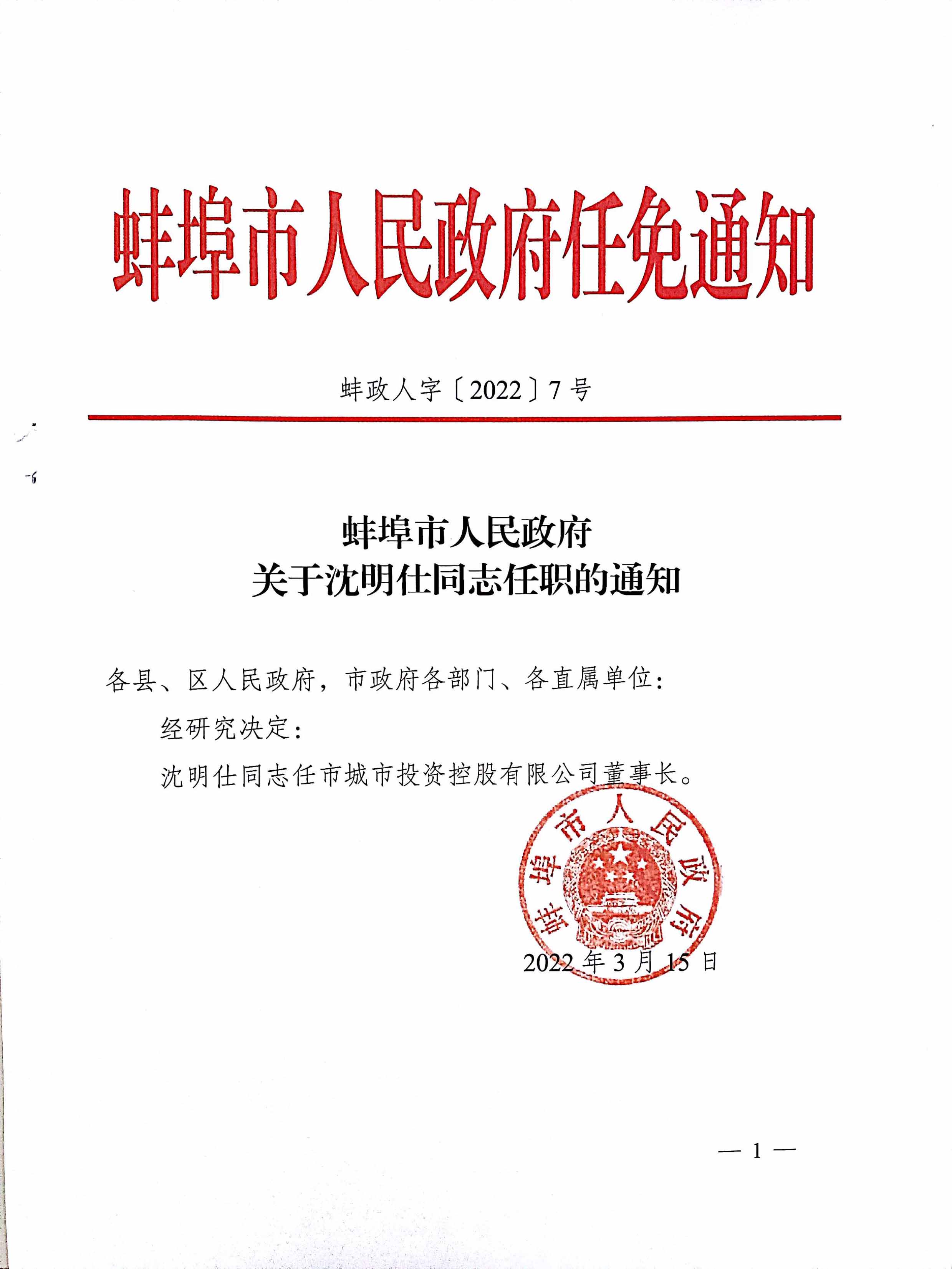 沈明仕同志任城投公司董事長