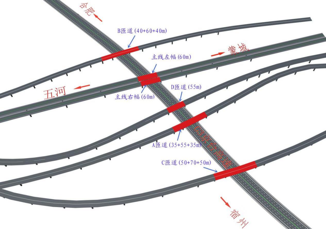 五蒙高速包集樞紐共有5座橋梁上跨G3京臺高速工程,分別為主線特大橋,A、B、C、D匝道橋,采用55m、60m、70m鋼箱梁單跨跨越京臺高速,為G3京臺高速預(yù)留出“四改八”條件。
